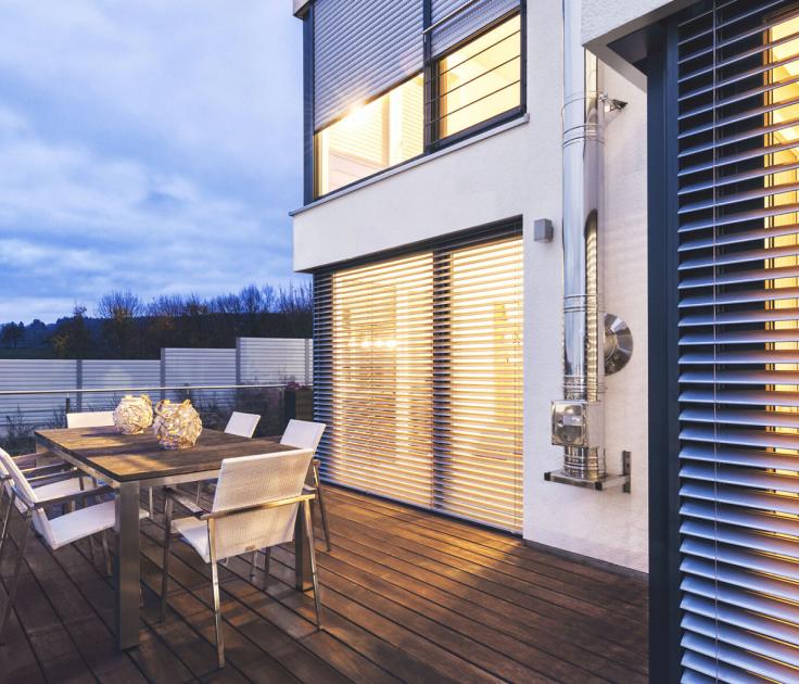 Ideal zur Nachrüstung und im Neubau – ohne Eingriff in die Bausubstanz. Der Raffstorekasten wird außen vor das Fenster gesetzt und kann architektonisch betont oder dezent integriert werden.