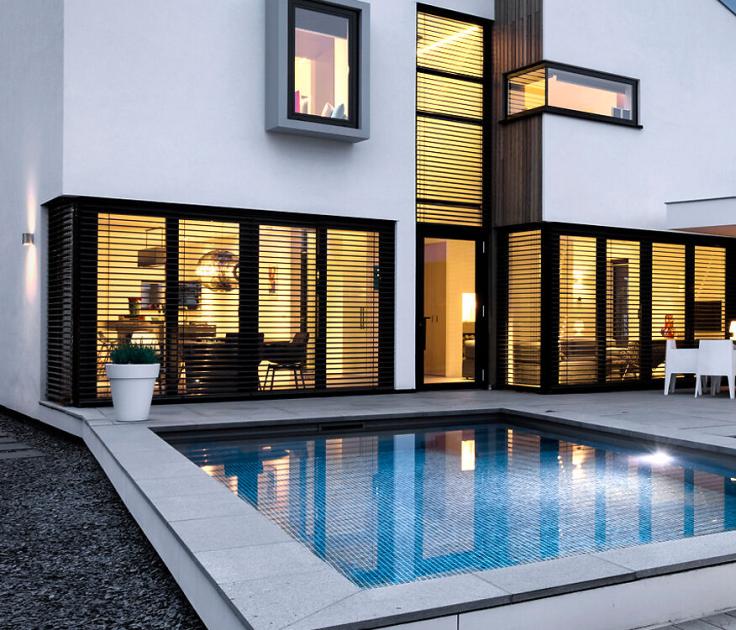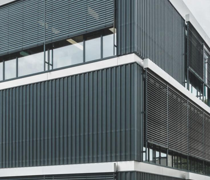 Fassadenraffstoren werden direkt vor der Fensteröffnung montiert und erlauben flexible Lösungen für große Glasflächen oder komplexe Fassadenstrukturen.